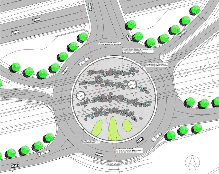 Die Autobahnanschlussstelle Innsbruck- Mitte durchlief ein langes und umstrittenes UVP- Verfahren. In diesem Zuge wurde ein landschaftspflegerischer Begleitplan erstellt, dessen Kernstücke die alleeartige Neupflanzung und die künstlerische Gestaltung des unter einer bestehenden Autobahnbrücke liegenden Kreisverkehrs bildeten. Beide Elemente wurden in dieser Form nicht realisiert.