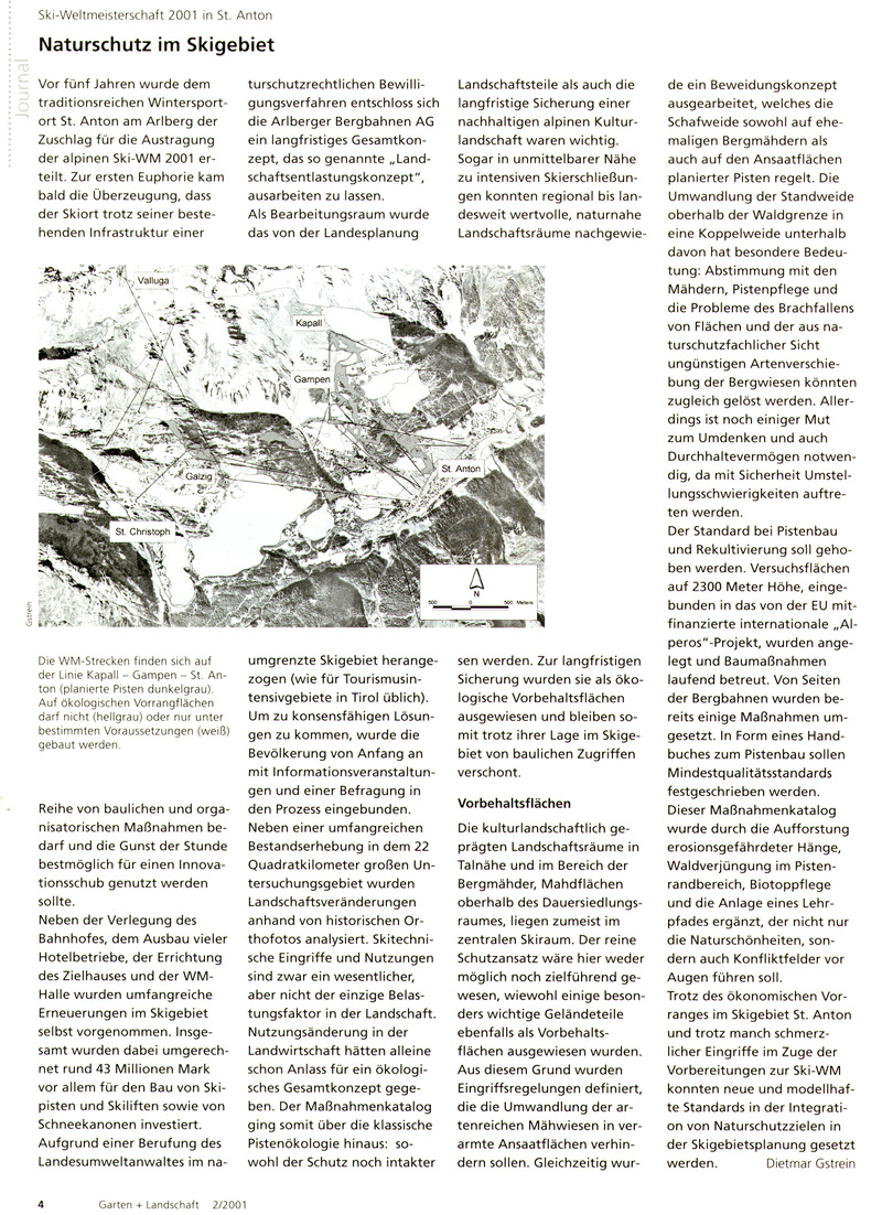 Auf Intervention des Landesumwelt-anwaltes wurde für das Schigebiet St.Anton aufgrund der zahlreichen WM-Baustellen das sogn. "Landschaftsentlastungskonzept" ausgearbeitet. Basierend auf umfangreichen Erhebungen wurden langfristig ausgelegte Maßnahmen zum Landschaftsschutz innerhalb des Schigebietes definiert.